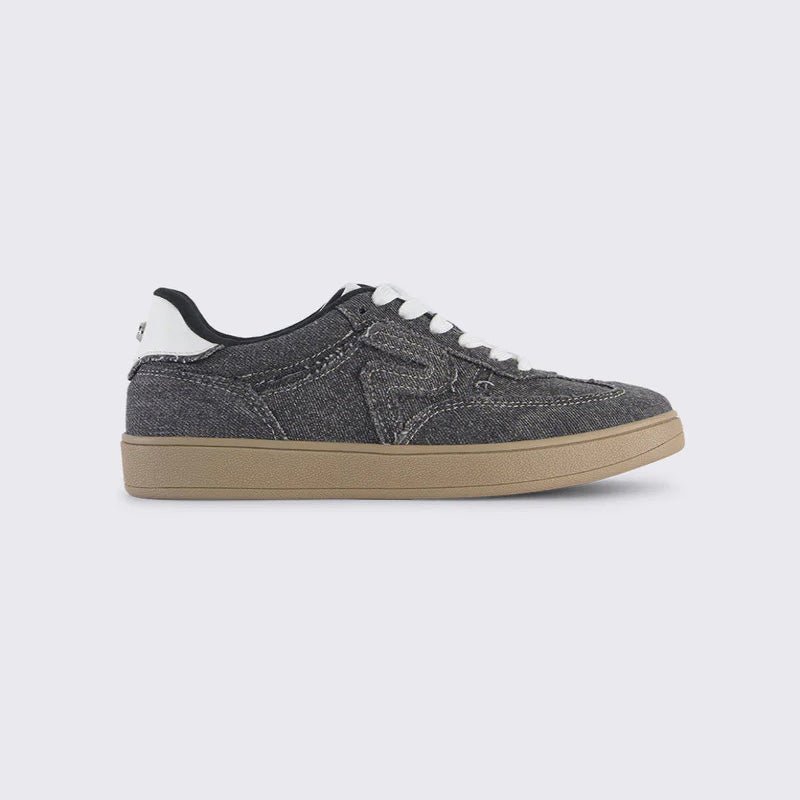 נעלי סניקרס לנשים בשילוב צבעי ג'ינס וסולייה חומה העשויות מבד וגומי. גובה הסולייה : 3 ס"מ